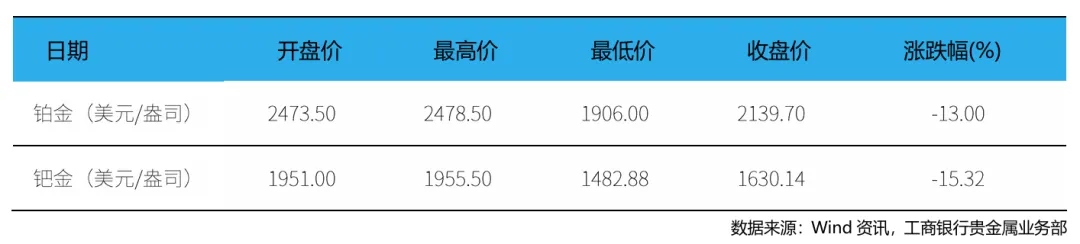 本周(12月29日 – 1月4日,下同),现货铂金开盘价为2473.5美元/盎司,最高价为2478.5美元/盎司,最低价为1906美元/盎司,收盘价为2139.7美元/盎司,周累计下跌13%。现货钯金开盘价为1951美元/盎司,最高价为1955.5美元/盎司,最低价为1482.88美元/盎司,收盘价为1630.14美元/盎司,周累计下跌15.32%。