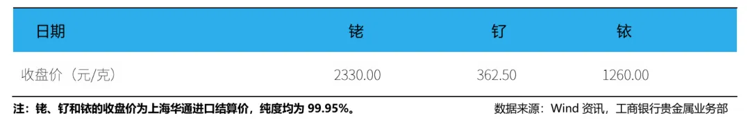 根据上海华通的数据显示,截至1月2日,99.95%现货铑金进口结算价为2330元/克,上涨6.39%。99.95%现货钌金进口结算价为362.5元/克,上涨38.62%。99.95%现货铱金进口结算价为1260元/克,上涨5.88%。