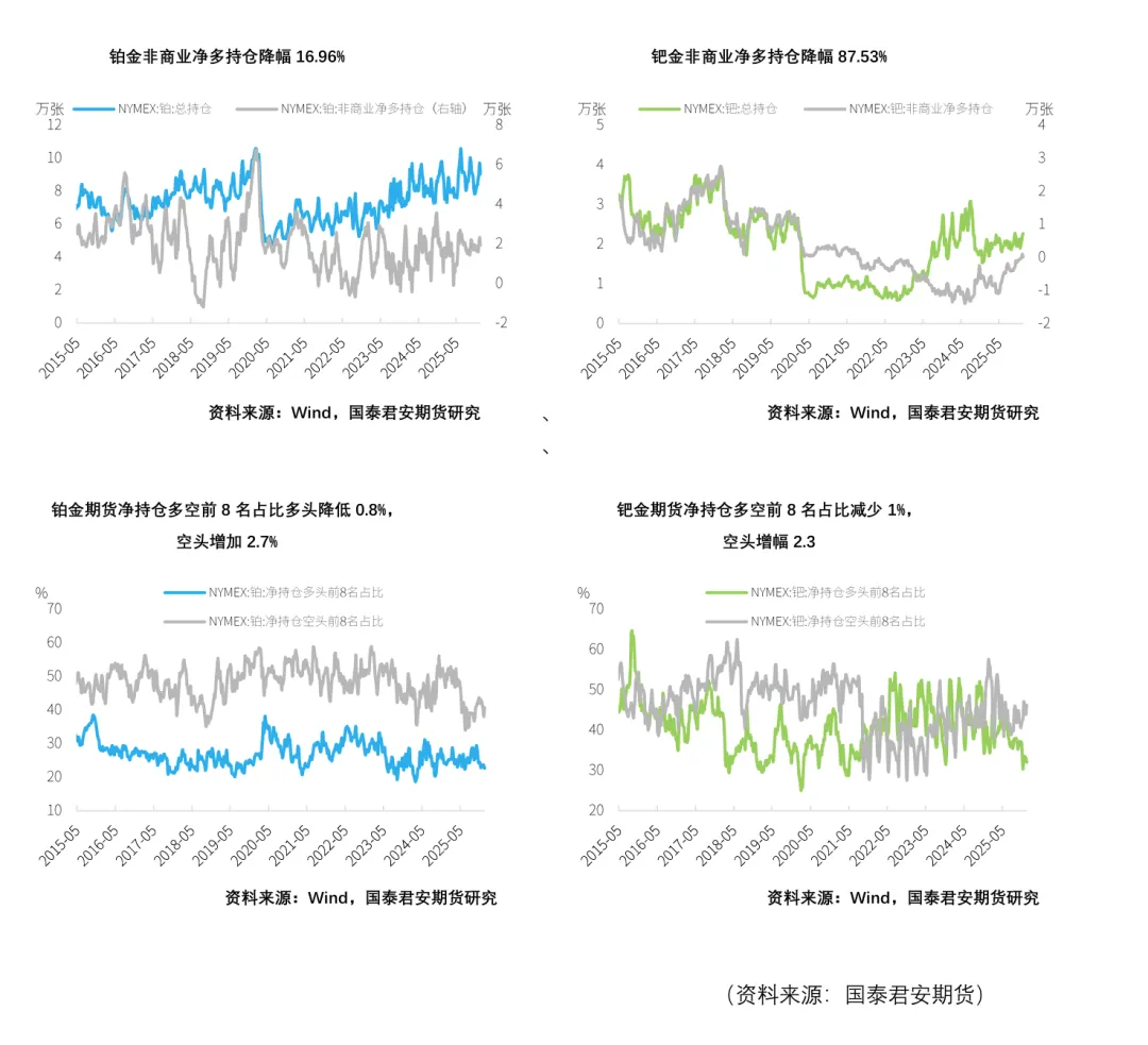 截至2025年12月23日,铂金总持仓较上周减少6765张,其中非商业多头方面减少9593张,非商业空头持仓较上周减少5643张,降幅16.39%。因此,非商业净多头持仓减少3950张,降幅16.96%。钯金方面,总持仓增加648张,增幅2.94%,其中非商业多头持仓增加76张,增幅0.65%,空头增加932张,增幅8.74%,因而非商业净多持仓减少856张,降幅87.53%。在净持仓多空前8名占比上,本周铂金方面净持仓多头占比降低0.8%,空头占比增加2.7%,钯金方面多头占比减少1%,空头占比增幅2.3%(因美国政府先前停摆,数据缓慢更新中)。