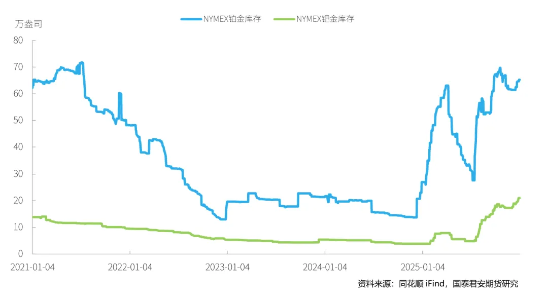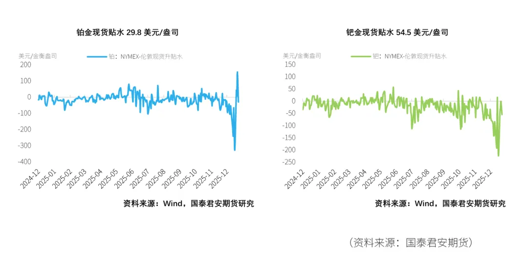 截至2026年1月2日,当周NYMEX铂金库存累库0.74万盎司,钯金期货库存累库。在现货升贴水方面,本周铂金升贴水波动较大,以周五收盘价来看贴水29.8美元/盎司。钯金则维持贴水,周五贴水54.5美元/盎司。ETF持仓量情况,铂金持仓量抬升,其全球ETF持仓量本周增加3.25万盎司,钯金持仓量抬升,ETF持仓量本周增加1.80万盎司。