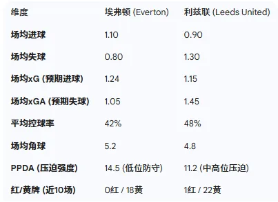深度解读: 埃弗顿的PPDA高达14.5,表明莫耶斯战术体系下球队倾向于放弃前场高压,退守本方半场组织紧密防线。这种策略在风暴天气下极为实用,减少了身后被打穿的风险。利兹联的xGA高达1.45,显示其防线在面对高质量射门时极为脆弱,尤其是在客场。