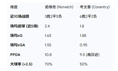 深度解读: 诺维奇的xGA高达1.55,说明其防守依然漏洞百出,近期的连胜主要依靠超常的进攻效率(Actual Goals > xG)掩盖了防守问题。考文垂则是英冠xG创造能力最强的球队之一,高位压迫(PPDA 9.5)极具侵略性。