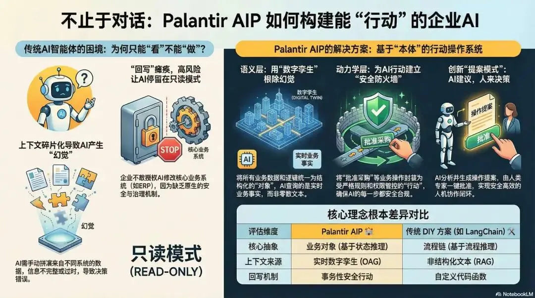 本文将深度剖析 Palantir AIP 如何通过Ontology(本体)构建“数字孪生”操作系统,在语义、动力学和动态层面上彻底解决上下文缺失与行动治理难题,并全方位对比其与 LangChain 等 DIY 技术栈的代差优势。
