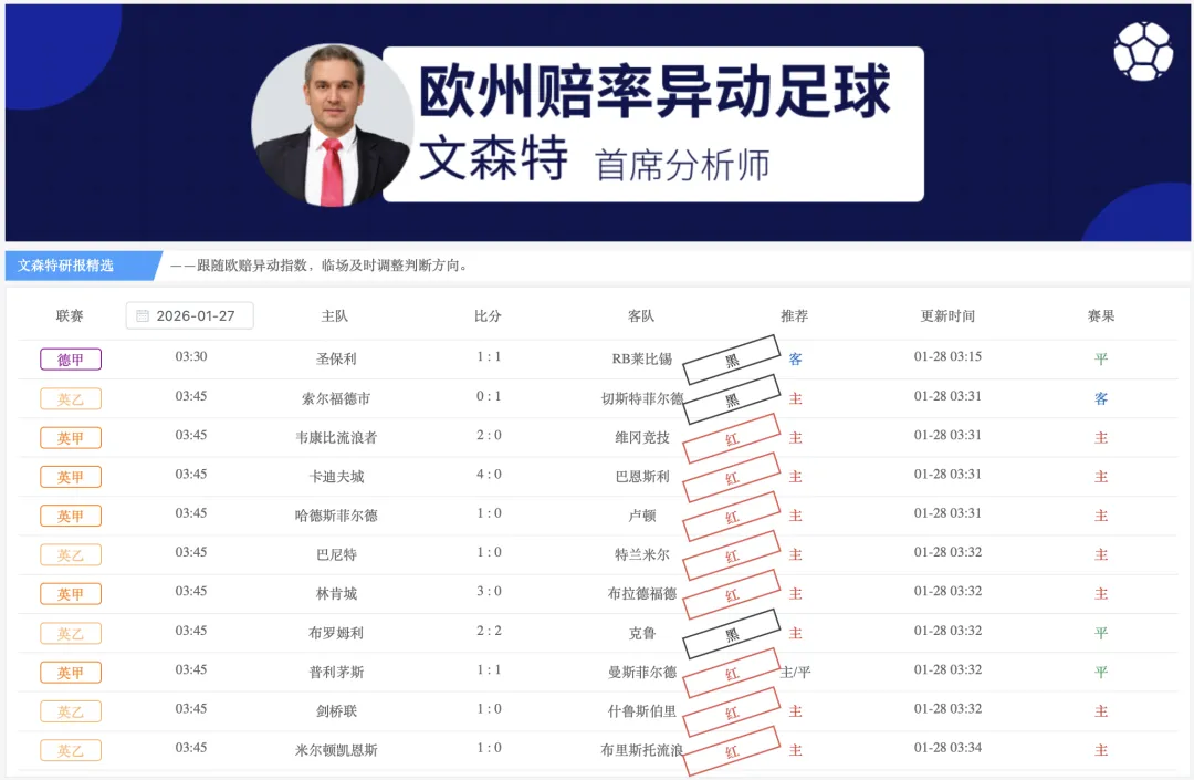 【欧指异动指数】(全赛事版)栏目的研报给出11场比赛,8红3黑,1月累计206红90黑,净胜116,观察20家主力公司的临场指数变化,掌控比赛方向,1月稳定性达到69.6%。