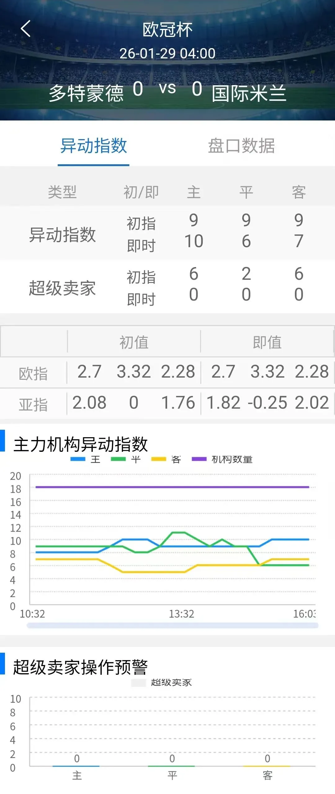 异动指数初指:9-9-9,发生罕见的无异动,数据博弈后,临场:10-6-7,主升平客双降,其中平数值降幅最大,无异动变为平异动,机构对分胜负缺乏倾向。