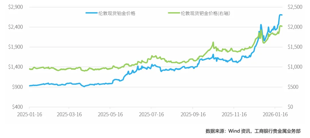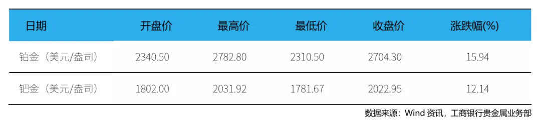 本周(1月19日 – 1月25日,下同),现货铂金开盘价为2340.5美元/盎司,最高价为2782.8美元/盎司,最低价为2310.5美元/盎司,收盘价为2704.3美元/盎司,周累计上涨15.94%。现货钯金开盘价为1802美元/盎司,最高价为2031.92美元/盎司,最低价为1781.67美元/盎司,收盘价为2022.95美元/盎司,周累计上涨12.14%。