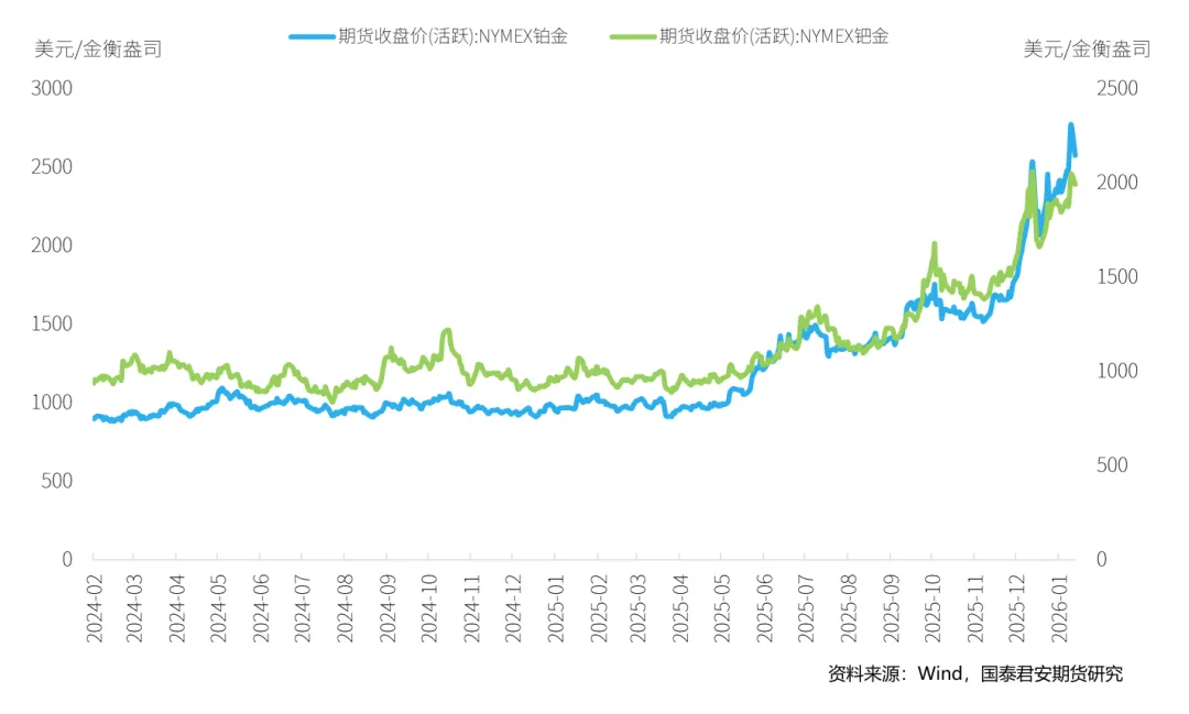 本周,铂金期货价格大幅上涨,截至2026年1月23日,NYMEX铂金期货价格收盘价为2773.2美元/盎司,周累计上涨14.79%。钯金方面,本周NYMEX钯金期货同样上涨,周五收盘价为2047美元/盎司,周上涨9.73%。