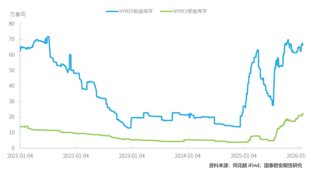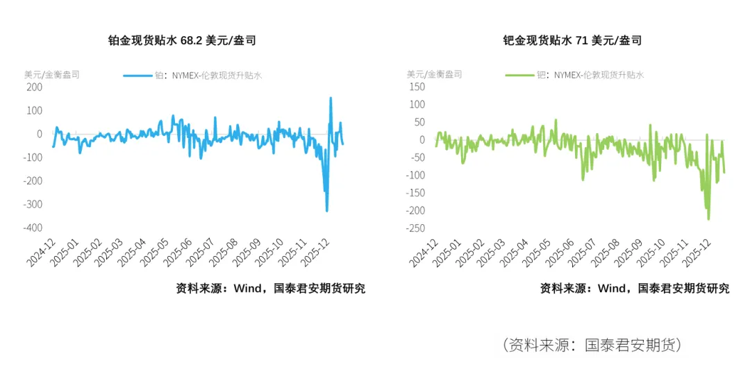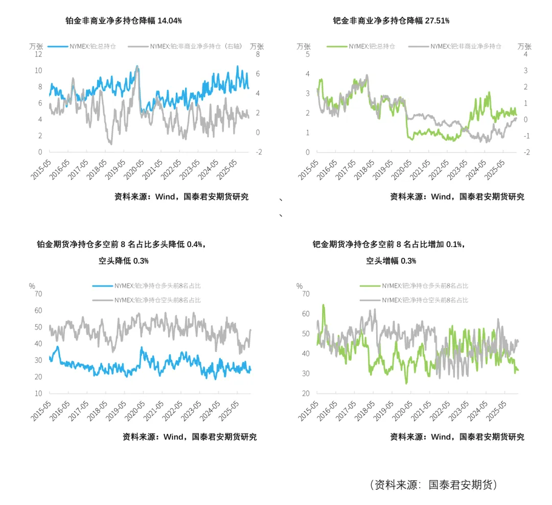 截至2026年1月20日,铂金总持仓较上周增加672张,其中非商业多头方面减少1032张,非商业空头持仓较上周增加1438张,增幅6.21%。因此,非商业净多头持仓减少2470张,降幅14.04%。钯金方面,总持仓减少316张,降幅1.62%,其中非商业多头持仓减少305张,降幅3.07%,空头增加32张,增幅0.37%,因而非商业净多持仓减少337张,降幅27.51%。在净持仓多空前8名占比上,本周铂金方面净持仓多头占比降低0.4%,空头占比降低0.3%,钯金方面多头占比增加0.1%,空头占比增幅0.3%。