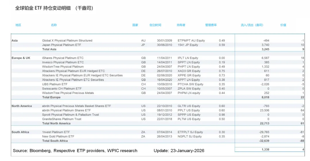 截至2026年1月23日,当周NYMEX铂金库存累库0.16万盎司,钯金期货库存累库。在现货升贴水方面,本周铂金升贴水波动较大,以周五收盘价来看贴水68.2美元/盎司。钯金则维持贴水,周五贴水71美元/盎司。ETF持仓量情况,铂金持仓量下降,其全球ETF持仓量本周减少0.08万盎司,钯金持仓量下降,ETF持仓量本周减少0.04万盎司。