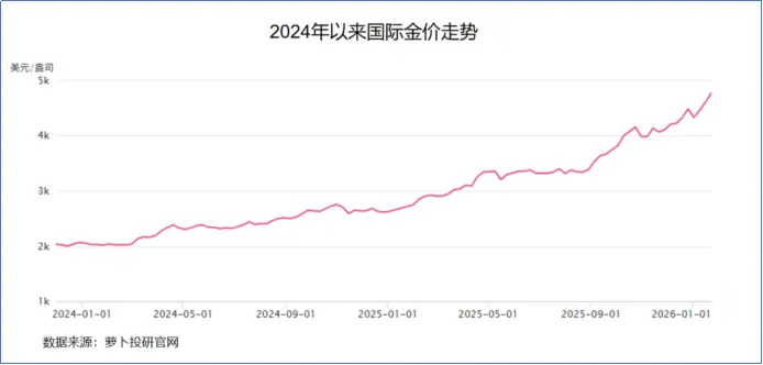 2024年以来,国际金价一路狂飙,接连创下历史新高。2024年1月,国际金价在2100美元/盎司左右震荡,而到了2026年1月末,国际金价已站上4800美元/盎司。