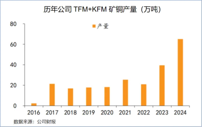 公司收购两座矿山后,迅速启动了扩产改造。2024年,TFM铜钴矿产能达到45万吨,KFM铜钴矿产能达到15万吨,直接推动公司跻身全球铜生产商第一梯队。
