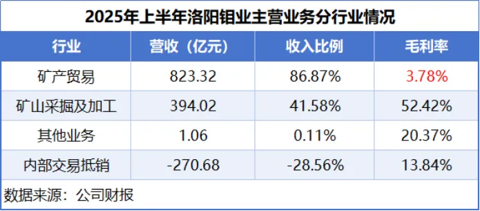 财报显示,洛阳钼业主要的业务并非采矿,而是矿产贸易。2025年上半年,公司来自矿产贸易的收入比例达到了86.87%。