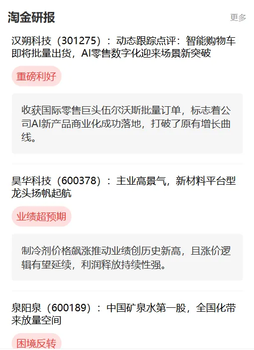 不符合以上条件的都不会纳入到淘金研报里面,比如那些符合预期、长期看好等等之类的废话,这样就把90%的无价值研报都过滤掉了。