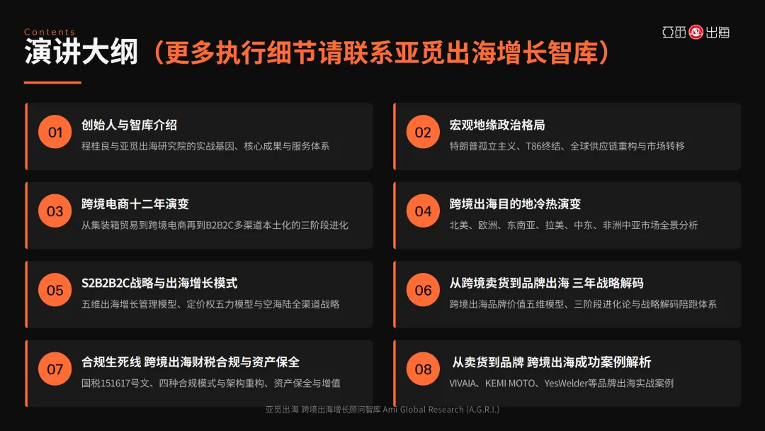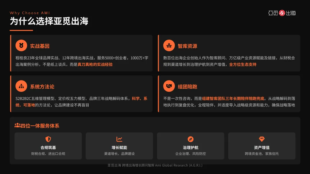 亚觅出海研究院(Ami Global Research Institute,简称A.G.R.I.)由程桂良先生于2018年创办,是中国领先的跨境出海增长顾问智库。作为中国跨境电商50人论坛特聘专家、暨南大学MBA校外实践导师、中山大学跨境出海合作讲师、广东省电商协会跨境电商专家执委会主任,程桂良先生拥有23年全球品牌实战经验(2003-2026)和12年跨境出海实战沉淀(2014-2026),已深度辅导陪伴5000+创业者,撰写1000万+字出海案例分析文章与视频内容。