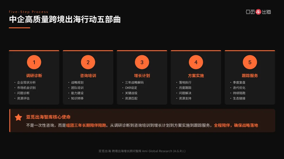 亚觅出海的核心使命是:不是一次性咨询,而是组团三年长期陪伴陪跑。从调研诊断到咨询培训,从增长计划到方案实施,从跟踪服务到持续陪跑,全程陪伴企业实现从"卖货"到"品牌"的惊险一跃,在反全球化新常态下开辟中企跨境出海的科学增长之路。
