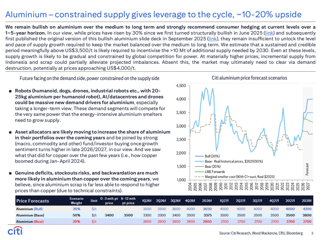 图1:花旗对铝价的多种预测场景,牛市情境下价格直指4000美元(来源:Citi Research)
