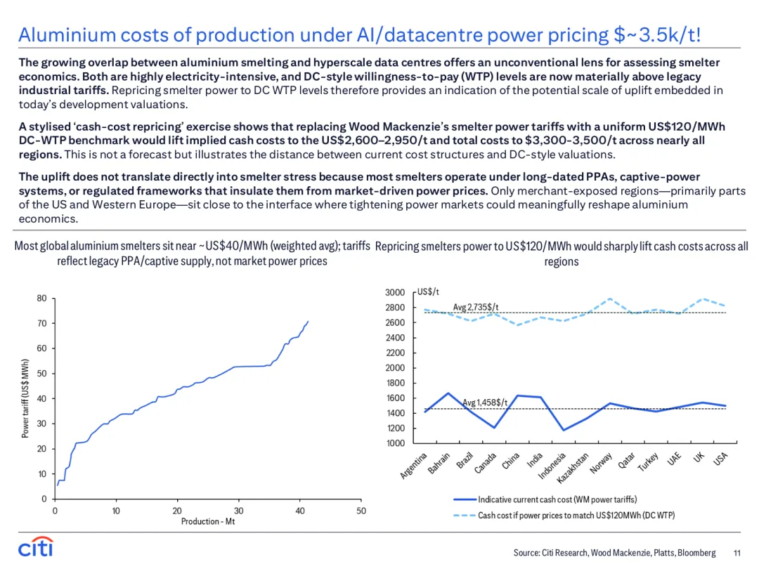 图2:若按AI数据中心电价重估,全球铝生产成本将发生结构性位移(来源:Citi Research)