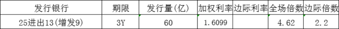 今日中国进出口银行发行3年政策性金融债,发行量60亿元,发行利率1.6099%,投标倍数4.62倍,边际倍数2.2倍。