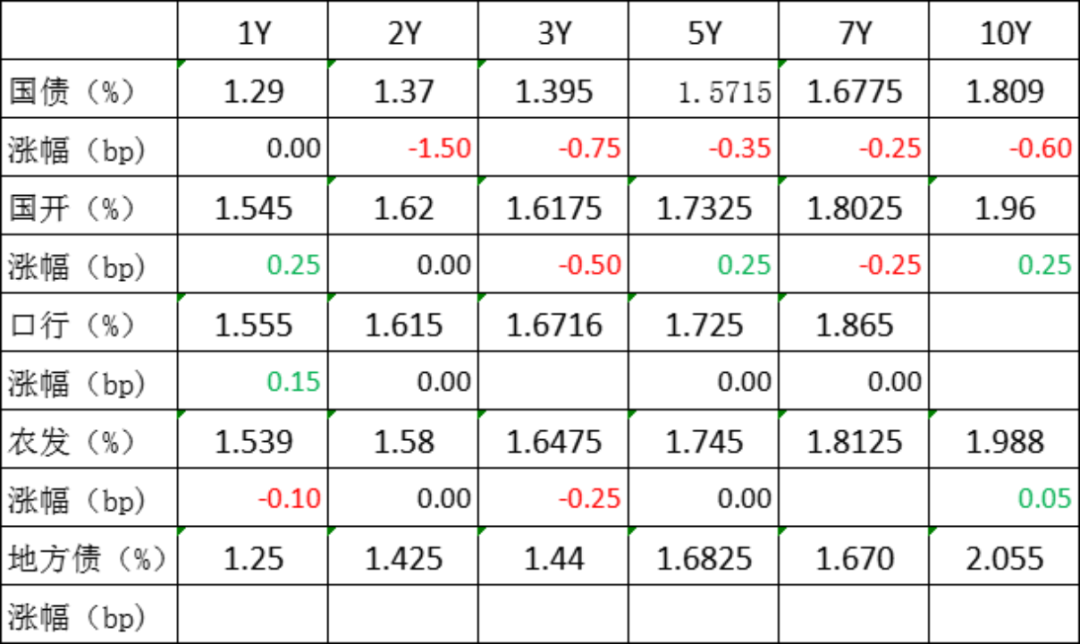 截止17:15,利率债二级市场中,利率成交价格总体呈下跌趋势,其中下跌程度较大的有2年期国债,收益率下跌1.5bp,报1.37%;3年期国债,收益率下跌0.75bp,报1.395%;10年期国债,收益率下跌0.6bp,报1.809%,3年期国开债,收益率下跌0.5bp,报1.6175%。