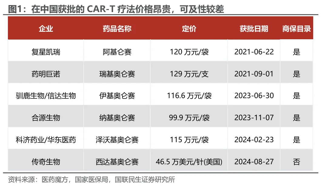 CAR-T细胞疗法为攻克那些目前难以治愈的癌症开辟了一条颇具潜力的革新性路径。国内目前已有六款细胞治疗类药品成功获批上市,与常规的标准治疗手段相较而言,细胞治疗疗法展现出了更为卓越的治疗效果,而且往往具备可接受的风险收益比。然而,鉴于细胞疗法属于高度个性化的治疗模式,其治疗成本高得惊人,一个完整疗程的费用往往高达上百万元,这无疑极大地压缩了能够从中获益的患者群体规模。
