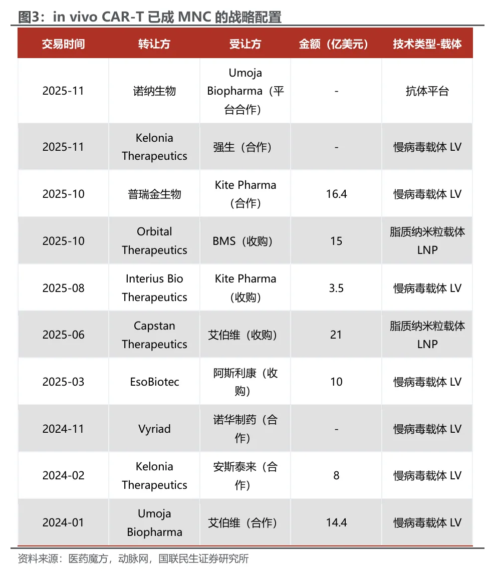 2025年3月,阿斯利康斥资10亿美元将EsoBiotec公司收入囊中,成功获取其慢病毒技术平台。同年8月,艾伯维以21亿美元现金的代价,完成了对体内CAR-T企业Capstan Therapeutics的收购。还是2025年8月,吉利德旗下的Kite公司以3.5亿美元的价格,收购了专注于开发in vivo CAR-T疗法的Interius Bio Therapeutics。到了2025年10月,BMS以15亿美元的金额收购了Orbital Therapeutics。