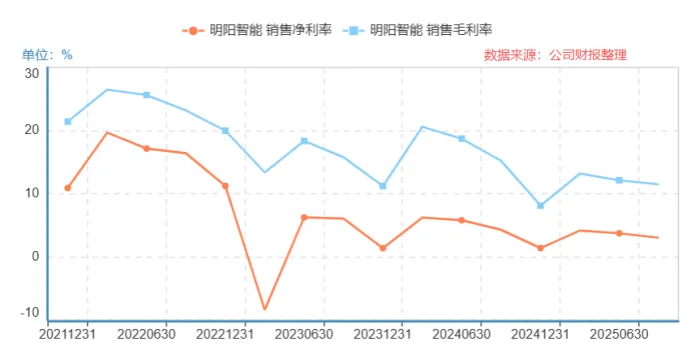 财报数据来看,2023年明阳智能实现净利润3.77亿,同比大幅下滑了89%,到2024年净利润继续同比下滑8%,2025年前三季度仍在下滑中。