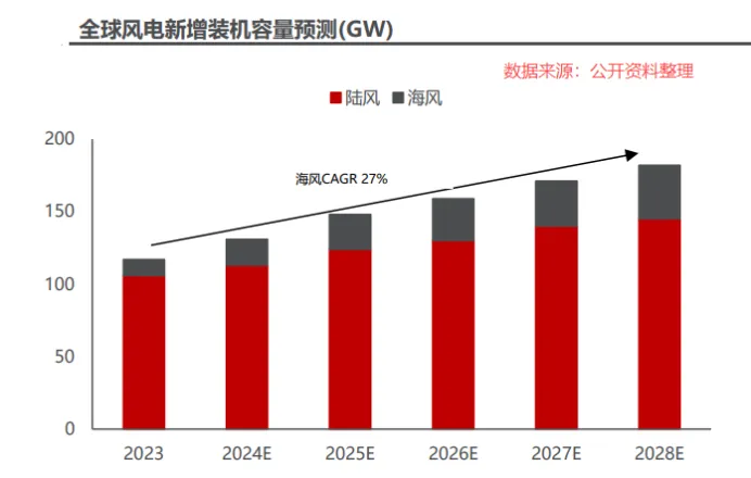 在海风降本增效以及风机大型化趋势推动下,全球海风装机依然保持高增速。数据显示,预计到2028年海风新增装机为37GW,未来3年的年复合增速近30%。