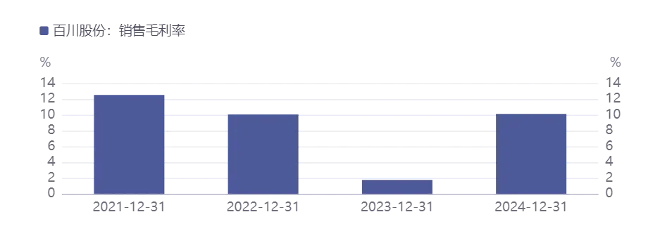 百川股份的毛利率和净利率在2024年显著改善,2025年上半年略有回升。2024年全年毛利率为10.14%,同比上升8.36个百分点,净利率为-1.58%,较上年同期上升12.29个百分点。2024年第四季度毛利率为13.43%,同比上升19.21个百分点,净利率为-2.95%。2025年上半年,毛利率为10.14%,净利率为-1.37%。这些数据表明公司在2024年整体盈利能力的改善,尽管净利率仍为负值。