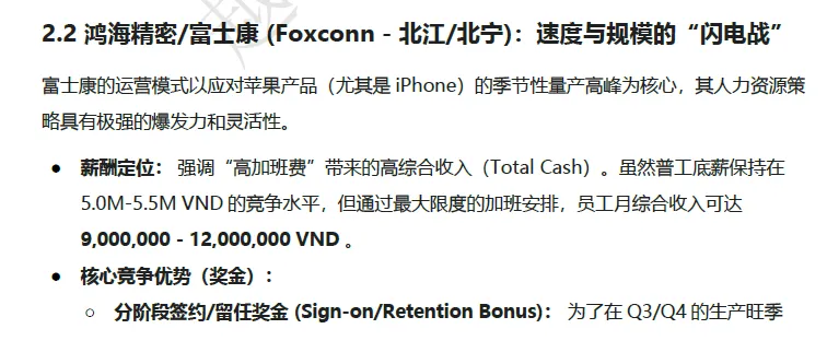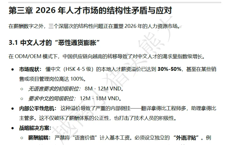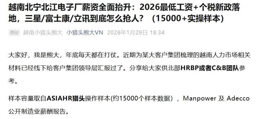 各位北越制造业同仁,我是熊大。本系列的所有内容均源自于ASIAHR团队的研报拆解,便于阅读。2026年越南北部电子制造业薪酬与福利战略深度研究报告,PDF原文,请后台留言私人邮箱,熊大会及时通过邮件分享给大家。2026年1月1日,越南将迎来史上最猛烈的薪酬合规大考。最低工资上调7.3%,个税扣除额暴增40%。在这个后廉价劳动力时代,HR只会算工资已经不够了。如果你还在按2025年的预算做2026年的Headcount Plan,那我必须给你敲个警钟:越南北部的薪酬逻辑,变天了。根据最新的第293/2025/ND-CP号议定书,2026年开年,北宁、北江这些电子重镇(二类地区)的法定最低工资将跳涨至 4,730,000 VND。你可能会说:“熊大,我们工厂起薪早就500万了,这有啥影响?”大错特错。如果你还在盯着法律规定的473万看,那你连简历都收不到。富士康和立讯在北江的普工实际招聘底薪已经杀到了 510万-550万 VND(不含各类补贴)。目前我们接触的项目都在对标三星的770万VND。底薪一动,加班费基数、工会费、社保上限全部跟着动。财务预算如果不预留10-12%的增幅,明年Q1你的P&L表会非常难看。熊大建议:不要把法定底薪当做你的宽带下限。把 5,300,000 VND 设为你的实际起薪锚点,否则你将在红河三角洲的抢人大战中直接出局。第110/2025/UBTVQH15号决议落地,个税起征扣除额从1100万暴涨到1550万 VND。对于月薪2500万的中级工程师,以前要交几十万的税,明年可能一分钱都不用交!HR的骚操作来了:在年度调薪沟通时,别只谈Gross Salary。给员工一张净收入对比表。告诉他:“虽然公司只给你涨了6%,但加上国家的减税,你拿到手的钱实际涨了10%!”【熊大核心观点】2026年,平庸的HR在纠结底薪成本,顶级的C&B专家在设计净收入最大化的Total Rewards。利用法律红利,把企业的成本压力转化为员工的实得实惠,这才是高手。(下一篇预告:既然要在北越混,就绕不开三座大山。三星、富士康、立讯精密,这三家巨头到底是怎么发钱的?我们怎么在夹缝中抢人?请关注系列第二篇:《三国演义》。)越南最低工资2026|越南个税改革2026|北宁薪资2026|北江薪资2026|海防薪资2026|永福薪资2026|越南电子制造薪酬报告|北越电子厂普工底薪|普工综合收入|加班费计算|留任奖金|返岗奖金|第13薪|津贴结构设计|语言津贴|中文溢价|HSK薪资|NPI工程师薪资|自动化工程师薪资|PLC工程师薪资|TE测试工程师薪资|PE/ME薪资|SQE薪资|QA/QC薪资|采购薪资|Sourcing薪资|PMC薪资|宽带薪酬|越南猎头|越南本地猎头|越南制造|回旋镖员工政策|三星北宁|富士康北江|立讯北江|歌尔北宁|仁宝永福|比亚迪富寿|越南HRBP|越南C&B越南“大出海”实录:一位中方外派的2026开年手记——熊大陪读林雪萍《大出海》系列(1)