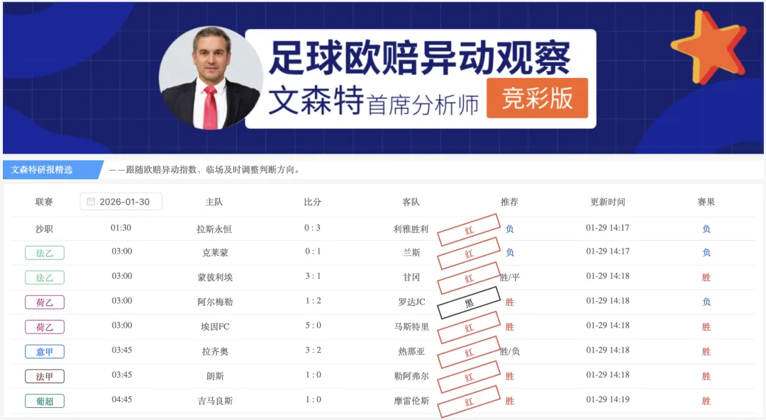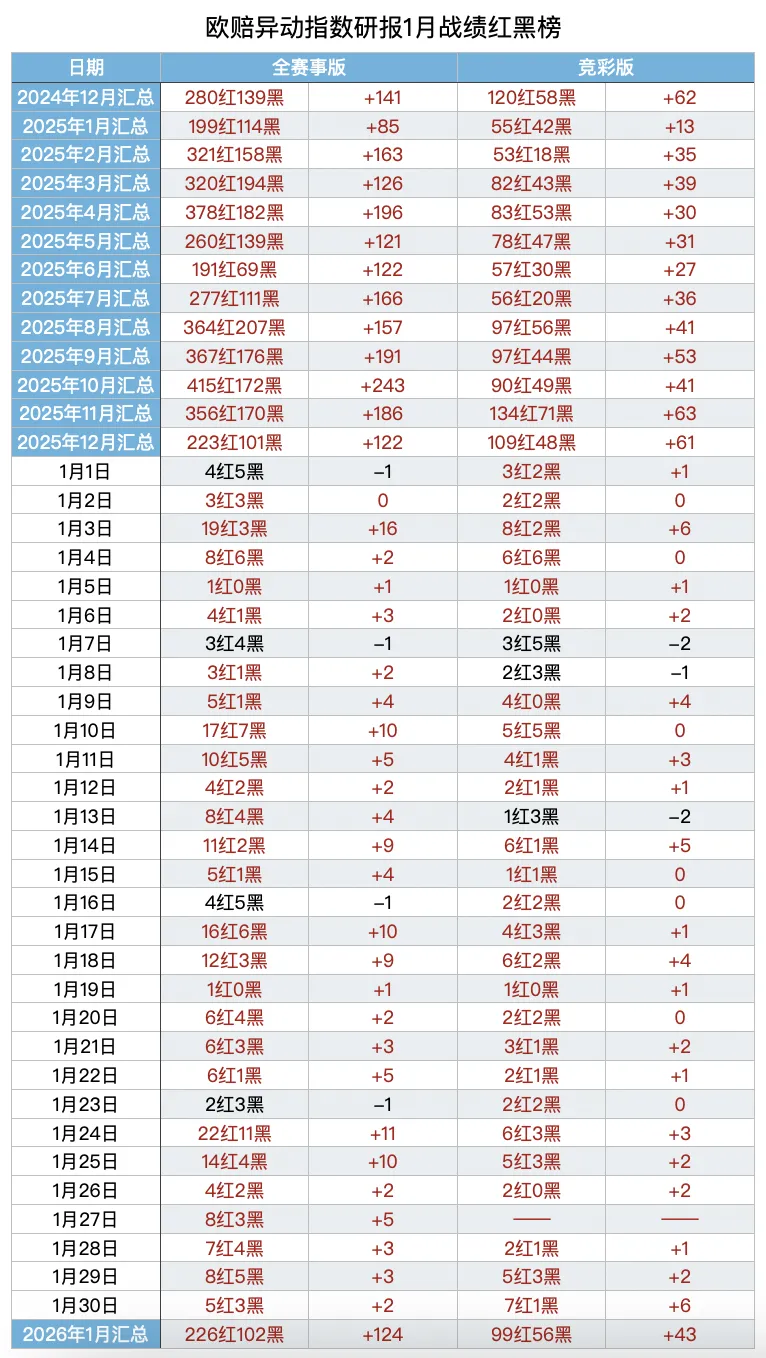 【欧指异动指数】(竞-彩版)栏目的研报给出8场比赛,7红1黑,1月累计99红56黑,净胜43,观察20家主力公司的临场指数变化,掌控比赛方向,1月稳定性达到63.9%。