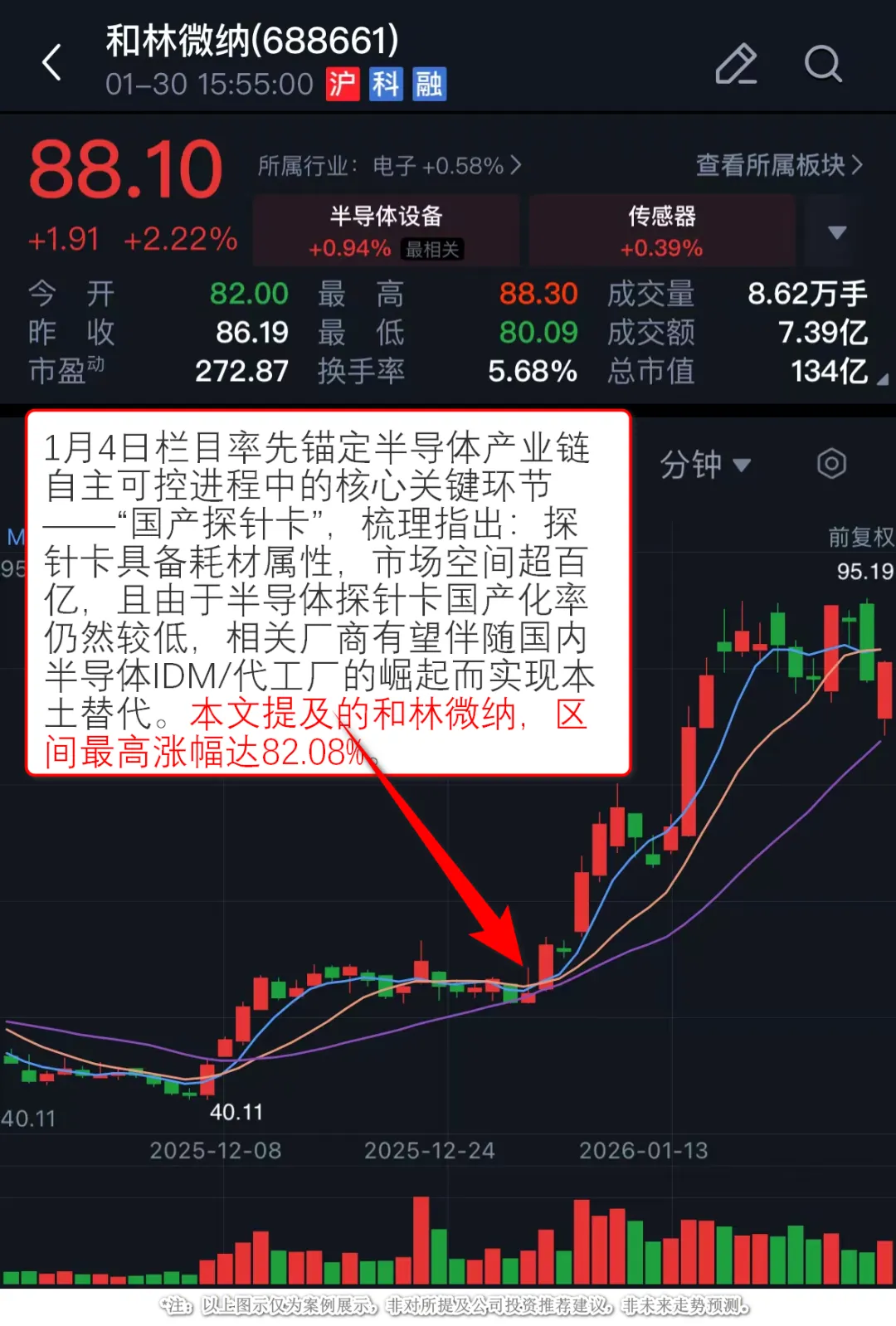 在行业价值逐步凸显、市场关注度亟待提升的关键节点,《风口研报》凭借其敏锐的行业洞察力、前瞻的赛道研判能力与专业的研究整合实力,于1月4日率先锚定半导体产业链自主可控进程中的核心关键环节——“国产探针卡”,通过对全质研报进行系统性筛选、深度拆解与逻辑梳理,提前为用户挖掘出这一兼具稀缺性、高成长性与战略价值的赛道:
