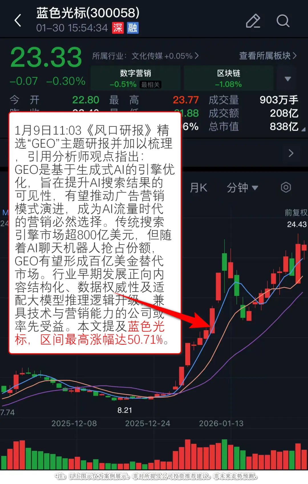 作为兼具技术与营销能力的头部企业,蓝色光标有望率先受益GEO浪潮,通过技术迭代与优质客户绑定,在AI流量时代占据先机。蓝色光标逻辑获资金认可,在1月展现强势上涨动能,区间最高涨幅达50.71%。