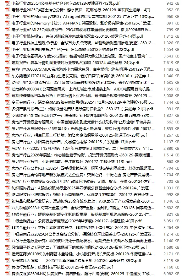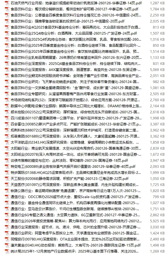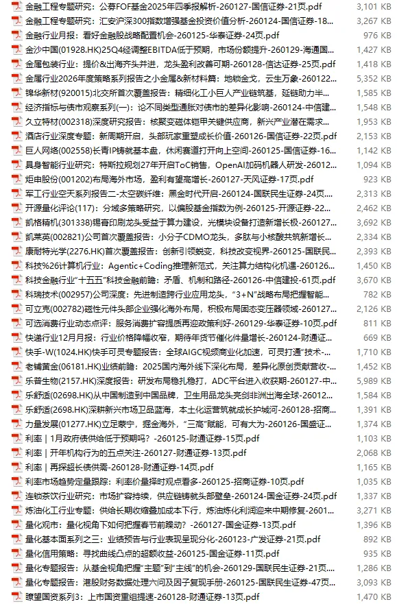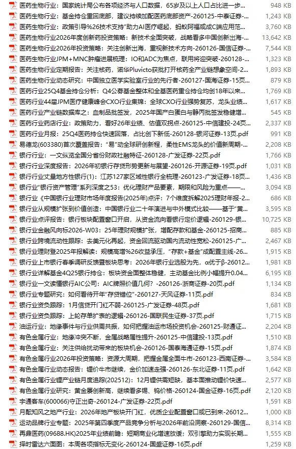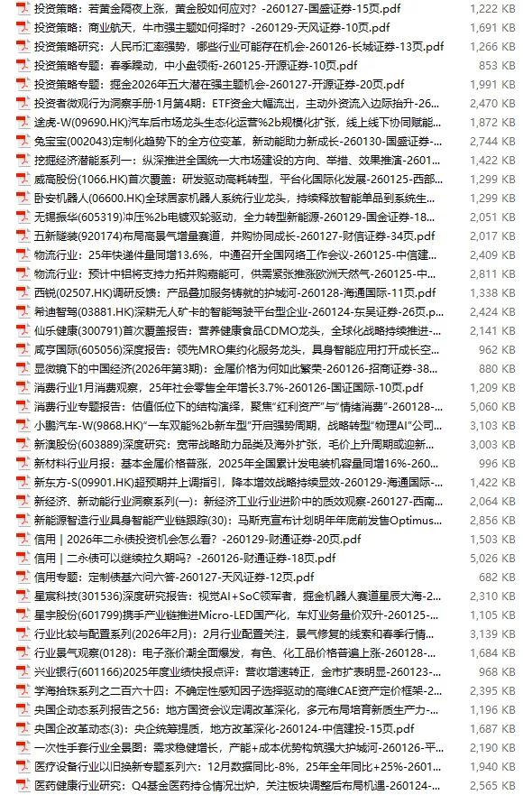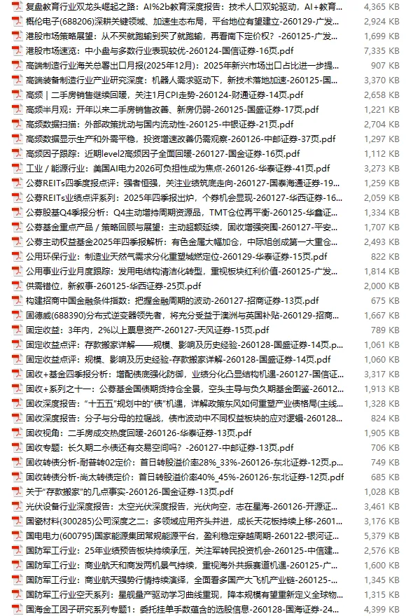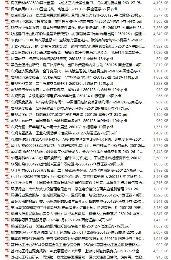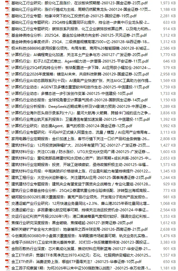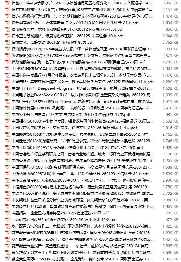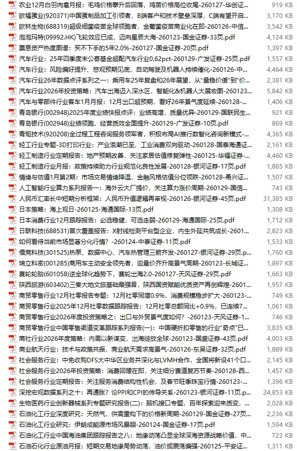 行业研报合集 2026年1月第4周1月第4周概要更新周期:1月26日—2月1日重点报告-433份国内券商报告-593份国际投行报告-43份外刊-11份其它(电子书、经管…)-10份报告总计:共1090份部分内容预览往期“研报合集”二零二一年【研报合集】2021全年汇总二零二二年【研报合集】2022全年汇总二零二三年【研报合集】2023全年汇总二零二四年【研报合集】2024全年汇总二零二五年【研报合集】2025全年汇总二零二六年——一月第1周第2周第3周 开通VIP,享专属权益