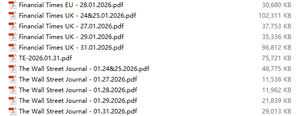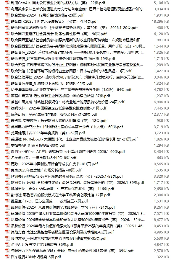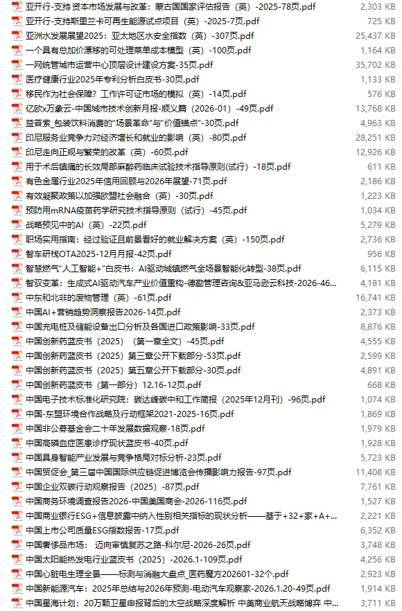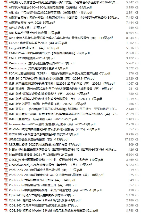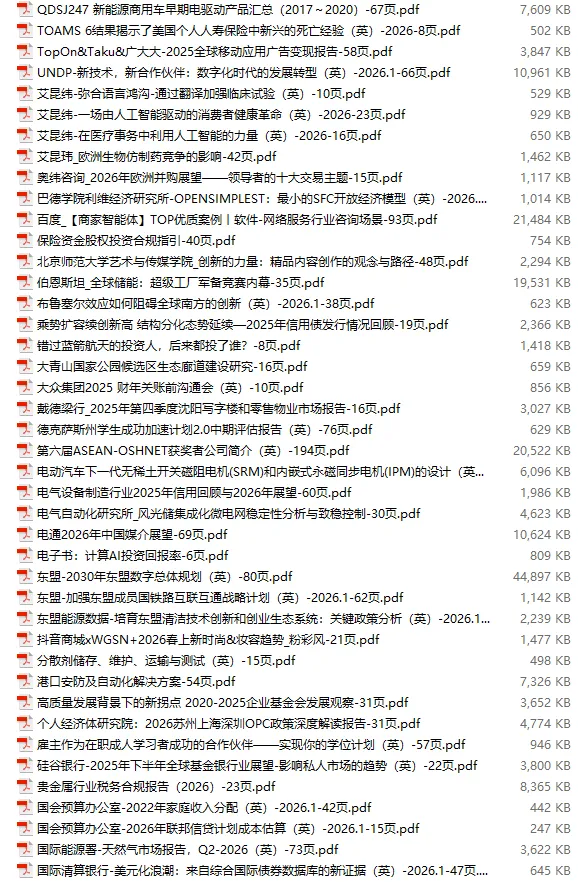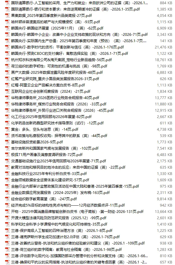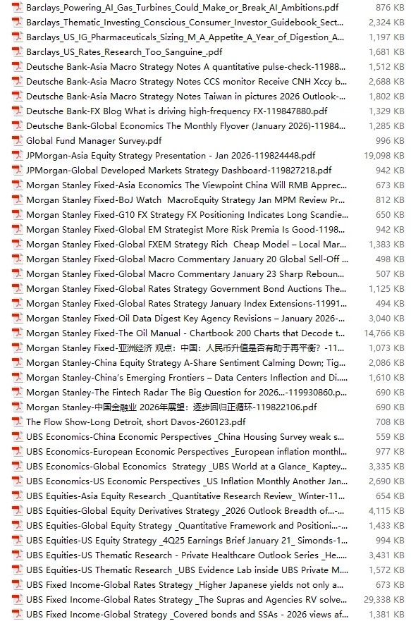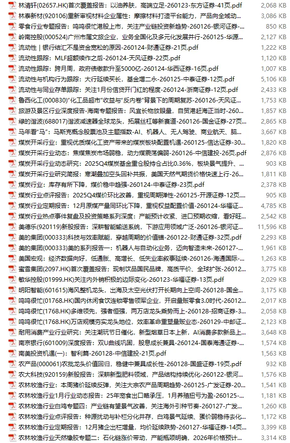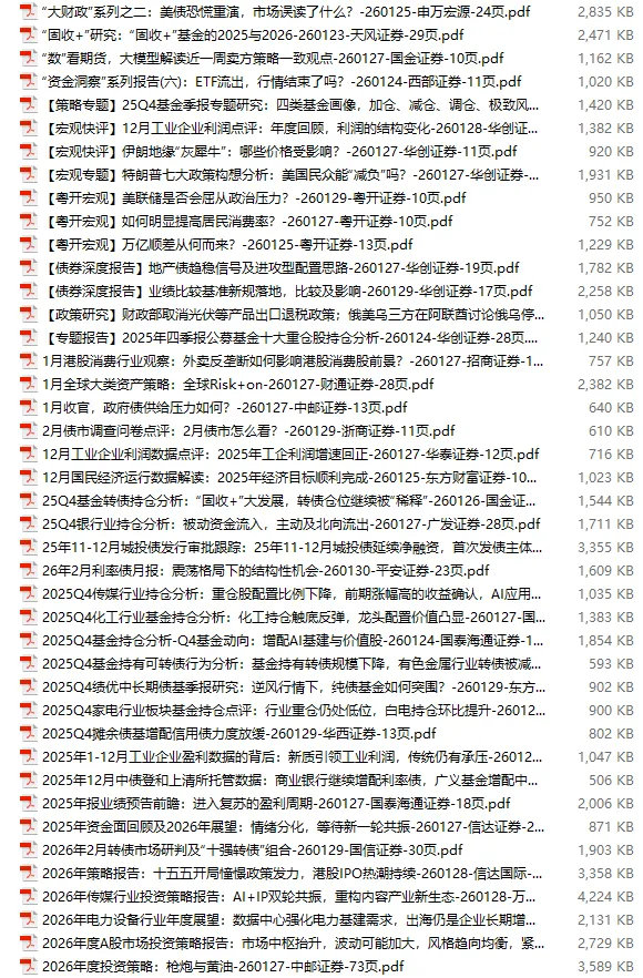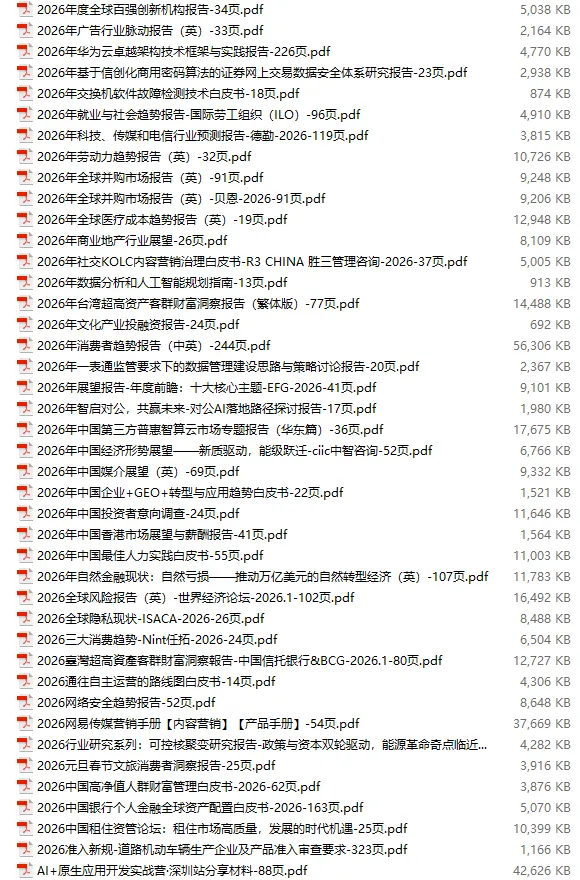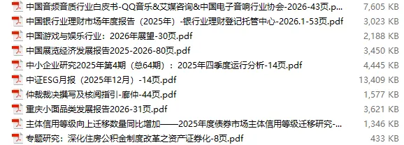 行业研报合集 2026年1月第4周1月第4周概要更新周期:1月26日—2月1日重点报告-433份国内券商报告-593份国际投行报告-43份外刊-11份其它(电子书、经管…)-10份报告总计:共1090份部分内容预览往期“研报合集”二零二一年【研报合集】2021全年汇总二零二二年【研报合集】2022全年汇总二零二三年【研报合集】2023全年汇总二零二四年【研报合集】2024全年汇总二零二五年【研报合集】2025全年汇总二零二六年——一月第1周第2周第3周 开通VIP,享专属权益