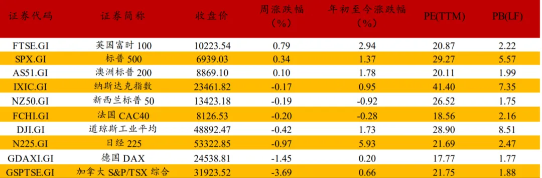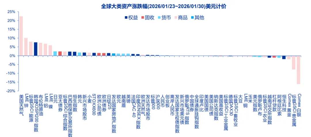 上周(20260123-20260130)特朗普鹰派提名扰动美联储政策预期,经济韧性与通胀粘性令货币政策两难,市场定价2026年美联储降息两次。市场担忧沃什立场偏鹰派,美元与10Y美债利率边际上行,流动性预期趋紧,叠加高位获利了结,贵金属大幅下跌。1)固收方面,10Y美债收益率录得4.26%,美元指数当前点位为97.1;2)权益方面,上周韩国、阿根廷市场股市上涨较多,A股指数恒生指数、恒生中国企业指数和上证50上涨较多,中证转债、科创50和北证50有所下跌,越南、日本股市跌幅较大;3)商品方面,上周黄金下跌2.01%,地缘政治风险集中爆发驱动原油上周上涨7.32%。