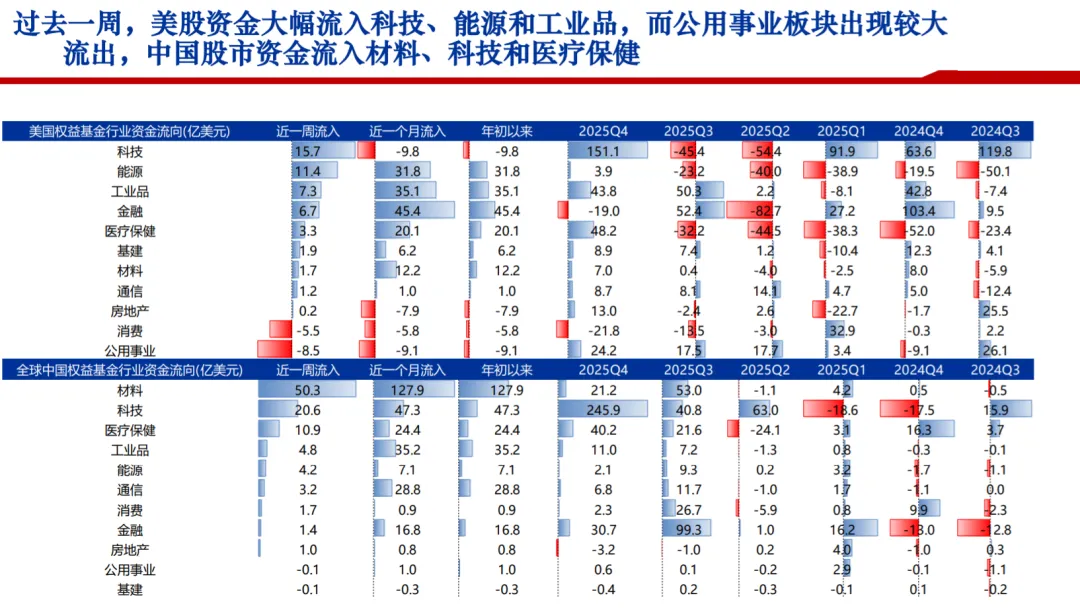 海外资金主动和被动方面,海外主动基金过去一周流入8.83亿美元,而海外被动基金过去一周流入17.41亿美元;内资和外资方面,外资过去一周流入26.23亿美元,内资流出600.12亿美元;过去一周,全球资金流入发达市场股市,大幅流出新兴市场股市;固收基金方面,美国股市流入明显,上周流入150.3亿美元;权益基金方面,中国股市流出573.9亿美元;相对资金流入方面,最近一周,中国固收基金相对流入明显,富时3倍做空中国ETF出现小幅流入;行业层面,过去一周,美股资金大幅流入科技、能源和工业品,而公用事业板块出现较大流出,中国股市资金流入材料、科技和医疗保健。