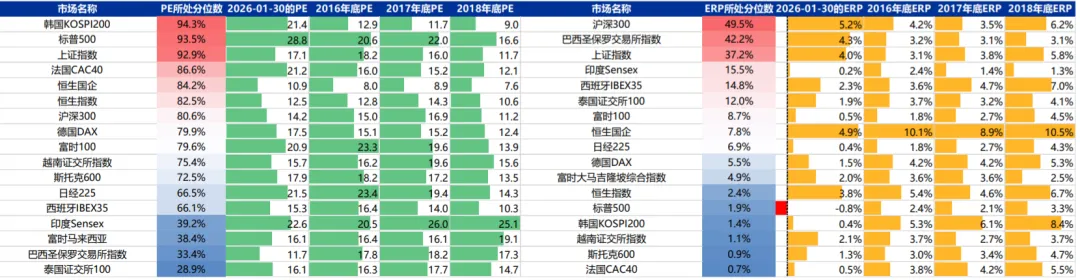 截止到2026/1/30,市盈率分位数角度上看,上证指数的估值低于韩国KOSPI200和标普500,超过法国CAC40,达到过去10年来的92.9%,但是从PE的绝对水平来看,上证指数、沪深300和恒生国企的估值依旧大幅低于美股。ERP角度上来看,巴西圣保罗、沪深300和上证指数的ERP分位数仍然较高,从股债性价比的角度来说,中国股市相比全球仍有较好的配置价值。风险调整后收益分位数来看,截止到2026/1/30,标普500的风险调整后收益所处分位数上升至47%,纳斯达克的风险调整后收益所处分位数由36%上升至39%。沪深300的风险调整收益分位数从78%上升至80%。GSCI贵金属的风险调整后收益分位数持续保持在100%分位数。