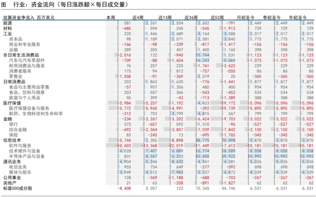 资金流向:资金加速流出,科技板块内部分化上周,标普500成分股估算资金流(涨跌额x成交量)为-84.1(亿美元,下同),上周为+5.6,近4周为+50.1,近13周为+1.2。15个行业资金流入,9个行业资金流出。资金流入的主要有:技术硬件与设备(+40.3)、媒体与娱乐(+39.5)、电信业务(+9.6)、半导体产品与设备(+8.3)、能源(+5.8);资金流出的主要有:软件与服务(-106.0)、医疗保健设备与服务(-57.7)、零售业(-15.6)、汽车与汽车零部件(-7.1)、综合金融(-6.9)。