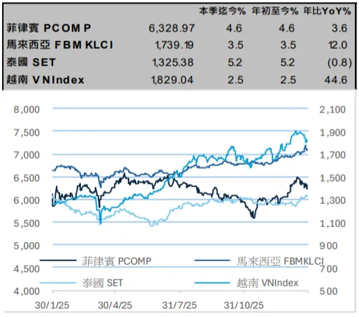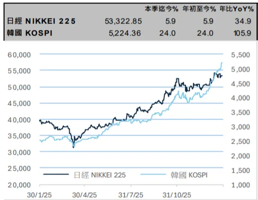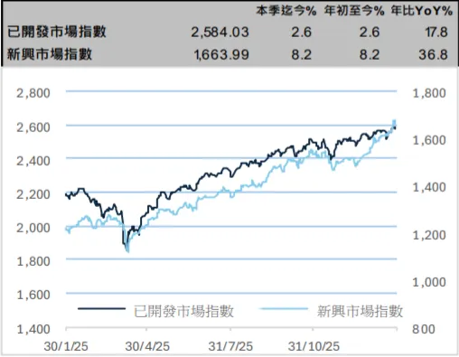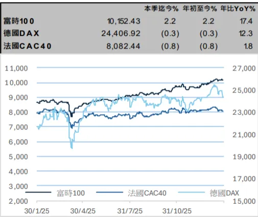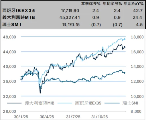 为提升战略自主能力,欧洲正推行更积极的财政政策,德国等国推出的大规模支出计划不仅聚焦国防军工领域,更成为撬动欧洲工业基础、基础设施及创新能力焕新的重要刺激手段。财政端发力的同时,货币端政策亦保持宽松支撑。当前欧洲通胀整体可控,英国央行与欧洲央行的偏鸽基调料将延续,进一步对股市估值及市场情绪形成正向支撑。