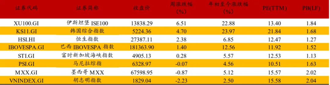 目前日经225指数的市净率达到2.48,市净率处于偏高状态。由于日本货币政策偏紧,经济基本面存在的问题较多,且日本股指估值较高,预计日经225指数中期仍然积蓄调整压力。由于经济基本面或美国贸易政策等因素或估值问题的潜在影响,预计阿根廷MERVAL、巴西IBOVESPA、韩国综合指数、印度SENSEX30等海外新兴市场指数容易出现波动。从亚太市场来看,韩国市场和日本市场的部分AI资产阶段估值仍然偏高,预计中期维度仍然容易出现调整。