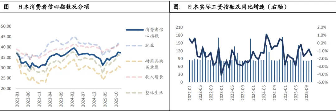 宏观:通胀放缓,日元大幅升值。12月日本消费者信心指数录得36.2,较11月36.4小幅回落,低于市场预期的36.6。本轮信心指数回调呈现分化格局,耐用品购买意愿环比降幅最为显著,显示家庭消费倾向边际转弱。11月实际工资同比收缩2.8%,较前月降幅进一步扩大。12月日本核心CPI同比上升2.4%,较11月显著回落,剔除生鲜食品和能源后的CCCPI同比上升2.9%,基础通胀略有降温但仍处历史高位。10年期国债收益率飙升至2.18%创1999年来新高,市场猜测美日联合干预汇率,触发日元空头大规模回补,日元兑美元急升至152。