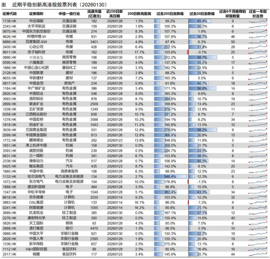 我们根据分析师关注度、股价相对强弱、股价路径平稳性、创新高连续性等角度在过去20个交易日创出过250日新高的股票池中筛选出平稳创新高股票。近期,中国秦发等股票平稳创出新高。按照板块来看,创新高股票数量最多的是周期板块,其次为科技、消费、制造和大金融板块。
