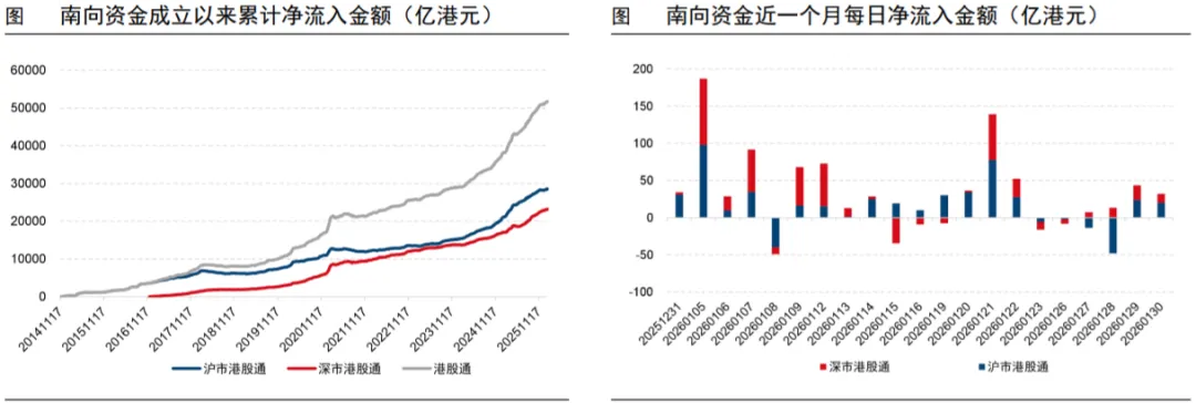⚫港股有望成为全球资金回流中国的“桥头堡”。截至目前,港股恒生指数的风险溢价远高于美国、欧洲以及日本等发达市场的代表性指数。人民币升值周期及中国资产性价比提升的共同作用下,2026年外资增配港股的动力或更强。2024年“924”以来,外资逐步扭转了此前的流出趋势,开始呈现小幅流入的态势,特别是自2025年4月特朗普加征全球“对等关税”以来,外资对中国经济实力的认知逐步重构,推动了外资的进一步流入。2026年,中国名义GDP改善将成为吸引更多配置型外资回流港股的重要驱动力。