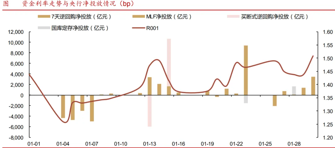 ►概况:1月资金面,两轮波动,中枢平稳回顾开年以来资金利率走势,月内资金经历两轮波动。第一轮波动于14日前后。随着央行回笼跨年资金,加之13日买断式逆回购续作时点错位,资金缺口压力达到阶段性峰值。叠加银行融出下降、北交所密集新股发行等多因素影响,资金利率于14日快速升至1.49%,R007亦突破1.6%。月内第二轮资金波动源于税期与跨月需求的紧密衔接,二者叠加推升资金价格季节性走升,R001、R007分别收于1.51%、1.64%,整体跨月压力不算大。全月来看,资金中枢仍维持平稳,R007月均值较前月下行2.2bp至1.55%、DR007小幅上行1.8bp至1.51%附近。隔夜资金中枢整体较去年12月有所上行,R001、DR001月均值分别环比上行4.7、5.5bp至1.41%、1.34%。1月资金面“变中趋稳”的背后,主要得益于供给端的支撑。一方面是央行投放相对“慷慨”,为资金面宽松奠定基础。1月国债买卖数据尚未公布,仅计算MLF和买断式回购,央行合计释放1万亿中长期资金,相当于降准0.5个百分点。另一方面是银行体系资金相对充裕,构成资金面的内生韧性。体现在1月银行融出规模持续位于高位,日均净融出达4.9万亿元,前月为4.8万亿元。同时,1月存单发行利率也逆势下行,与资金利率走势形成背离。此外,1月票据利率上行幅度、大行卖票规模均不及往年同期,或指向1月信贷增幅可能弱于季节性,相较于缺负债,银行可能更缺资产。