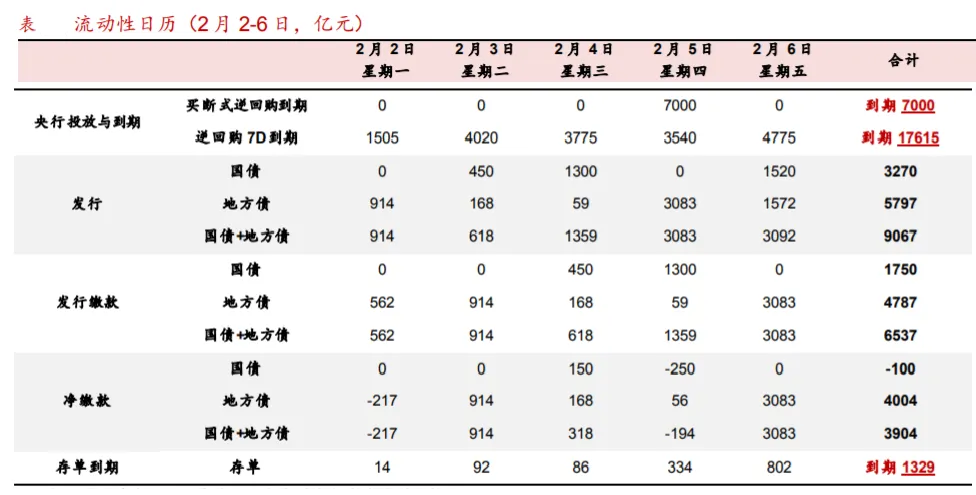 ►公开市场:2月2-6日,逆回购到期17615亿元2月首周(2月2-6日),公开市场合计到期24615亿元,其中逆回购到期17615亿元,到期压力大幅提升(2025年以来逆回购单周到期中位数为13828亿元);3M买断式逆回购到期7000亿元。不过,下周也是3M买断式逆回购的续作窗口,关注央行投放情况。