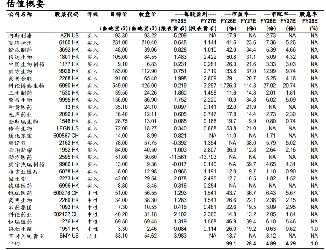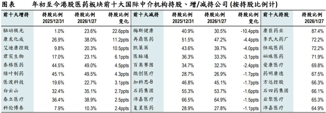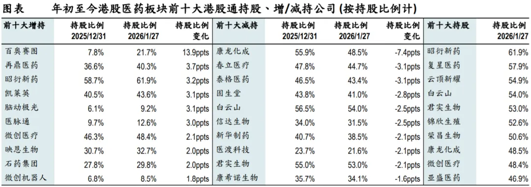 投资启示:据国家医保局公布,截至1月20日,近90%的基本医保目录上新药品和商保目录药品已实现进院和终端覆盖,我们建议持续关注医保新药放量节奏及商保目录落地进展。1月27日,先声药业的TL1A/IL-23双抗授权许可给勃林格殷格翰,总对价超10亿欧元。我们认为,2026年板块稳中向好态势延续,但仍有短期波动的可能,选股逻辑或将重回基本面和估值,关注存在基本面预期差、仍被低估、安全边际较大的头部个股。推荐关注以下细分方向:1)创新药:三生制药、和黄医药、百济神州等催化剂丰富、估值仍未反映核心大单品价值,可重点关注大单品的关键海外数据读出时间线;先声药业等标的被明显低估、长期成长逻辑清晰之标的,肿瘤和自免管线仍有诸多BD授权机会;2)CXO:受益于下游高景气度和融资边际回暖的细分赛道龙头,如药明合联;3)监管不确定性逐步缓解、叠加政策利好预期,有反转机会的医院、器械和诊断等子板块。