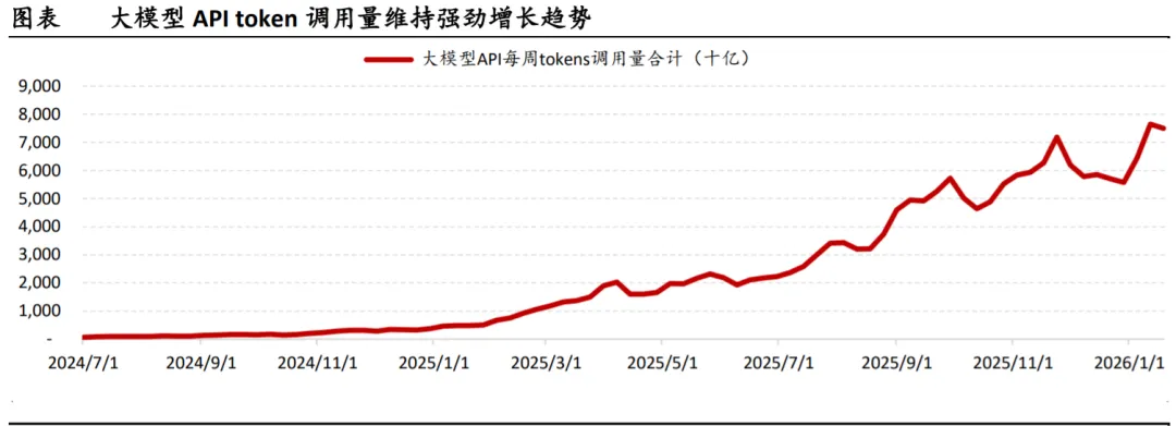 模型token消耗量维持强劲趋势:据OpenRouter数据,2026年1月前3周全球token日均调用量较去年12月增26%,token调用量前三为ClaudeSonnet4.5、GrokCodeFast1、小米MiMo-V2-Flash。最近几日阿里千问、DeepSeek、智谱、MiniMax的token消耗量明显增长(图3-6),受到模型/产品更新驱动。