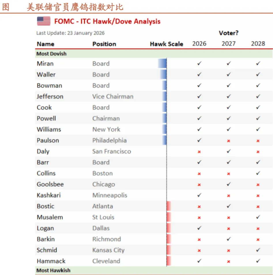 贵金属阶段性顶部已探明,边际定价将取决于地缘政治能否持续超预期、各国央行在金价高位是否继续购金、美联储换帅后能否超预期降息。地缘政治因素不可控,短期特朗普对格陵兰的稀土、委内瑞拉的石油诉求已经在金价层面充分兑现,后续需要更大催化才会超预期,可能需要观察美国与欧盟、加拿大等国家关系的边际变化。央行需求属于长期逻辑,金价高位下短期推动或有限。2025年1-11月主要增配黄金的国家是波兰(95吨)、哈萨克斯坦(49吨)、巴西(43吨)、土耳其(27吨)与中国(26吨)。从大国博弈角度黄金在央行资产负债表中占比持续有提升机会。但1月新闻显示人民银行仍在购金,俄罗斯、新加坡等部分央行已开始在高位出售黄金套现。边际上唯一有跟踪价值的依然是美联储、人民银行以及日本央行的降息节奏。以及观察是否在供给约束、地缘政治、气候异常等催化下,能源涨价驱动农产品反转机会,大宗商品上涨持续性超预期,再次推升贵金属投资价值。基本金属方面,外盘美联储换帅、内盘期货交易保证金提升,金属价格波动放大,但交易逻辑并未扭转。各个品种供给端偏紧、资本开支回落后新增产能有限的基本面仍在。美联储人选公布及美元指数波动或均属于短期事件扰动,不会改变中长期走势逻辑。特朗普对格陵兰及委内瑞拉资源诉求较强,在百年未有之大变局背景下,全球关键矿产供应链仍在重塑,各个品类有色产品金融属性、政治属性前所未有。