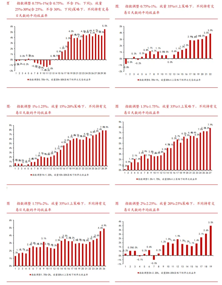 结论三:若仅考虑持有1个交易日,单日调整幅度处于1.5%至1.75%之间(含1.5%,不含1.75%,下同)和放量程度处于20%至25%之间(含20%,不含25%,下同)、单日调整幅度处于1.75%至2.0%之间和放量程度为超过35%两种策略的胜率均为100%,平均收益率为0.8%和1.3%,无论是胜率还是收益率都较为突出。