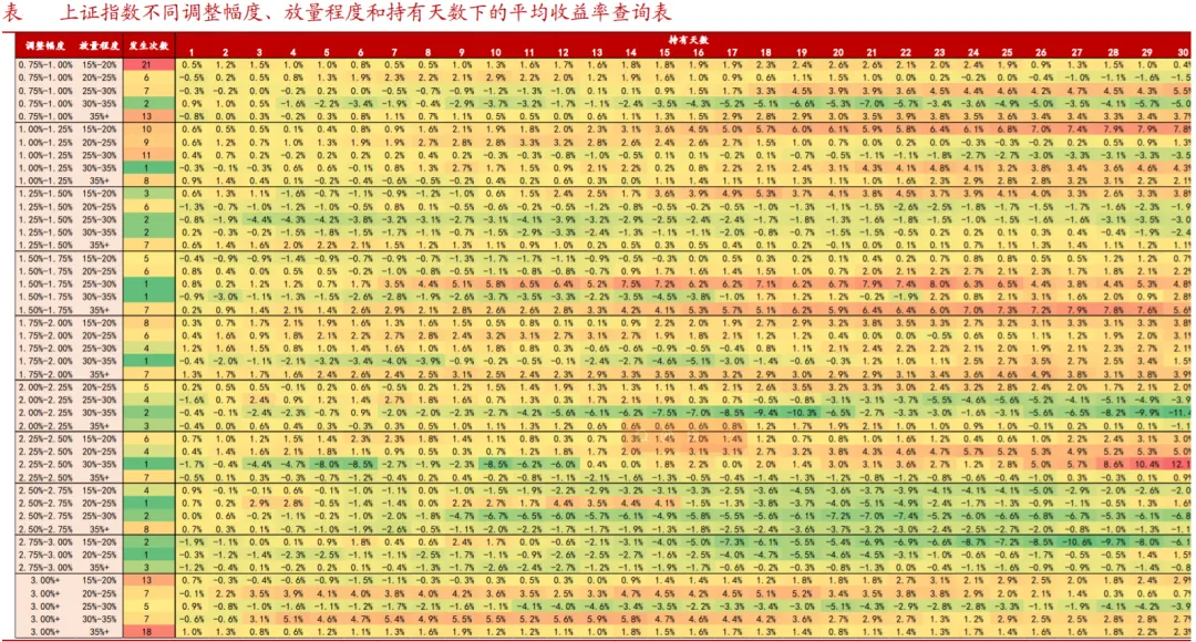 2025年上证指数有两次调整幅度较大,放量较为明显的情况,分别为4月7日和9月18日,出现后市场均走出了上行走势。为了探究上证指数放量调整后,市场如何表现,本文选取2000年年初至2025年底共26年上证指数数据,设定三个参数,分别是日内调整幅度、放量程度和持有交易天数,不同参数产生不同策略,进而测算策略的平均收益率和胜率(附有查询表)。以史为鉴,上证指数单日调整幅度处于1.75%至2%区间(含1.75%,不含2%),放量程度大于等于35%,历史上发生过7次,在持有第26个交易日,平均收益率高达4.9%。